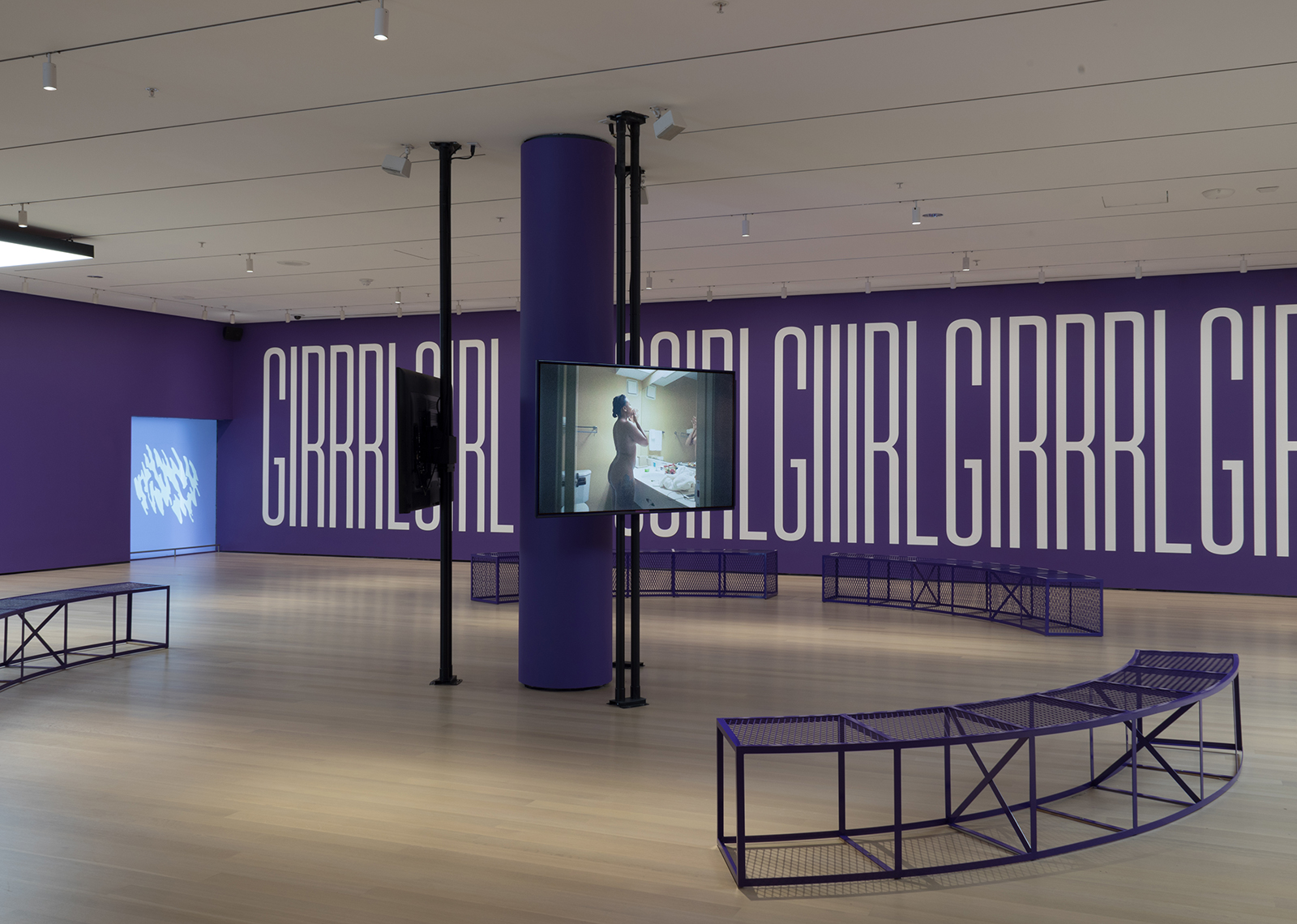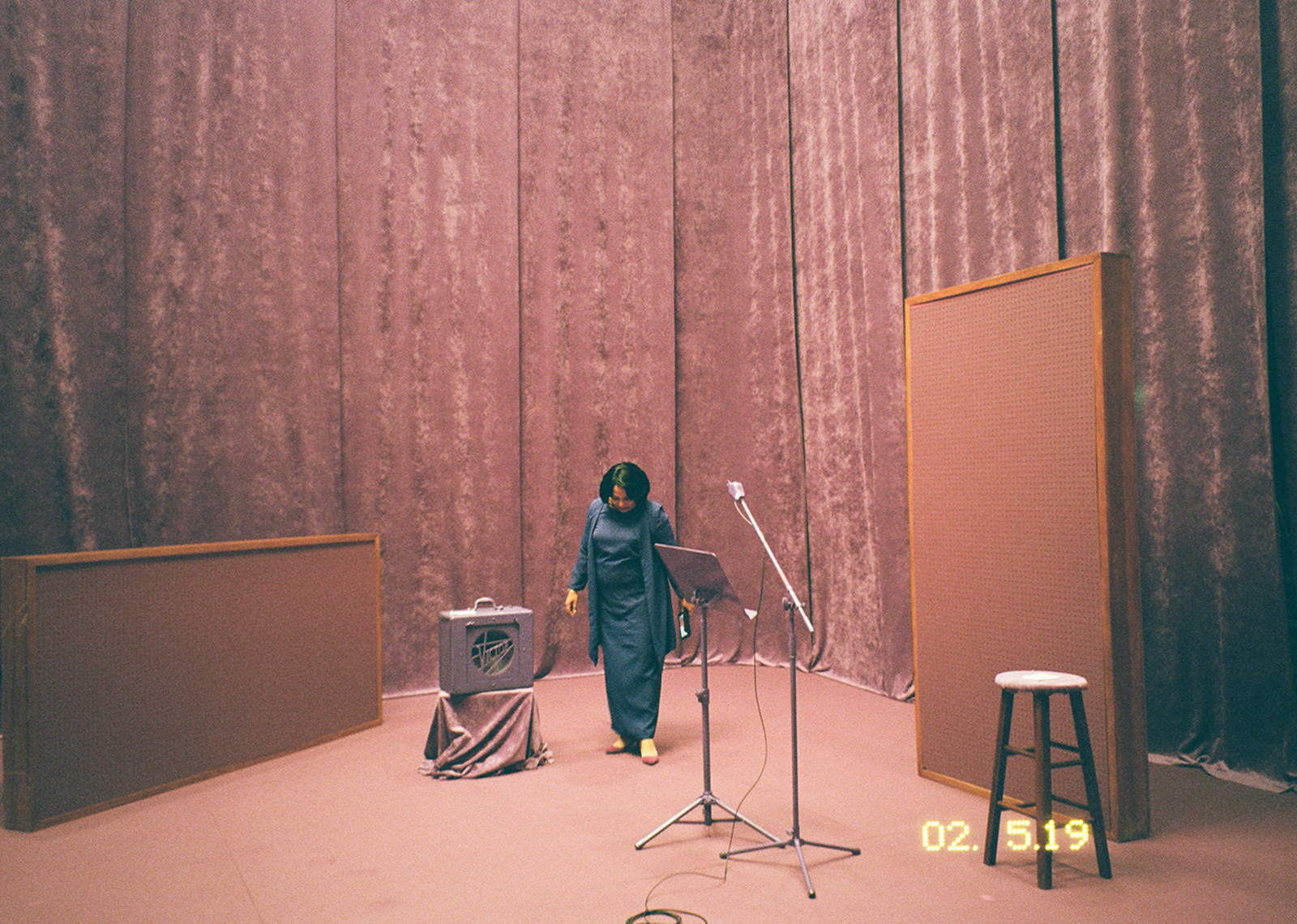 Each scene marks a shift of viewpoint in relationship to the action, illustrating the impossibility of the neutrality of the camera’s gaze. We follow Girl closely, watching as she gets ready, waits, kills time, reads, and flirts. In each scene, the camera performs different roles: the boyfriend, the audience, the surveillance camera, the documentary maker, the director. In one scene, the camera is recast again as Girl relaxes reading in the apartment. In another, a wide, fixed frame transports us to a family dinner and surveils her hotel room as she gets ready. A woman dressed all in purple, Mrs. Queen Esther Bernetta White, reads cue cards about how to present oneself to the world while standing and playing the piano on a purple sound stage. Text messages periodically disrupt the onscreen action to reveal her digital interactions with another screen, her smartphone.