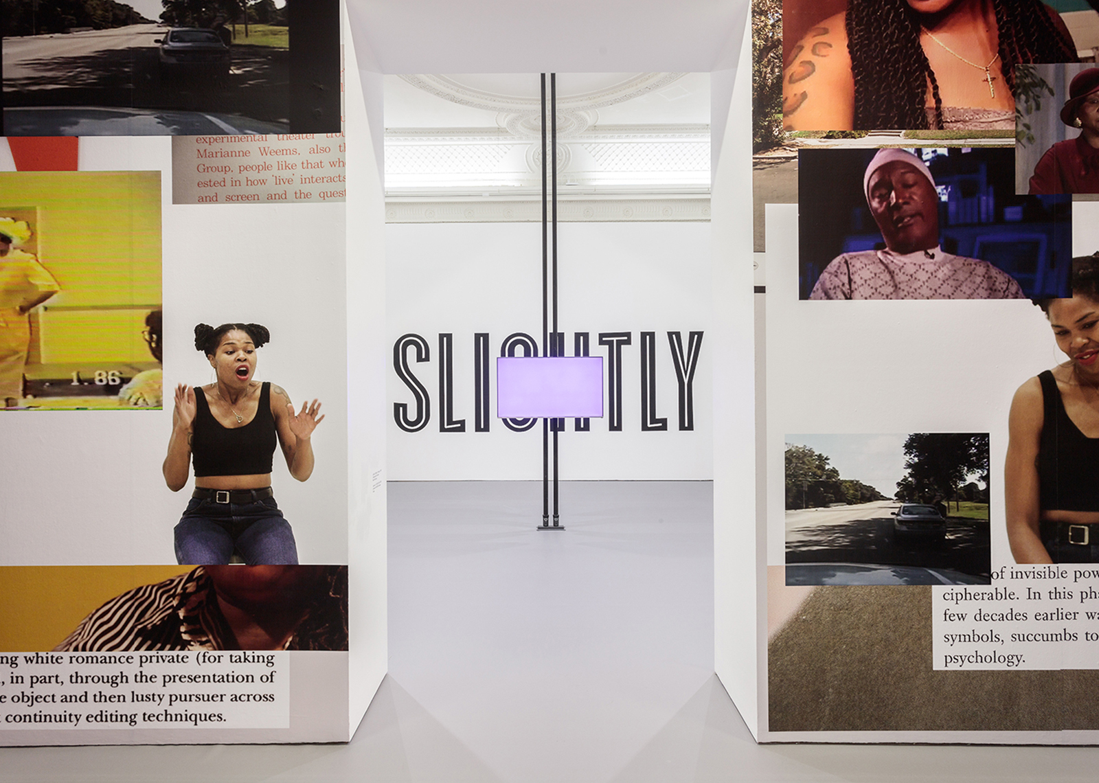 Martine Syms’ Lessons I-LXXXVI, 2014–, is an extended, incomplete poem about the black radical tradition. Each piece, or commercial, is thirty seconds in duration and articulates a lesson from the tradition. Structured as cantos—subdivisions of an epic or narrative poem—the first lessons in the series were inspired by poet Kevin Young’s book, The Grey Album: On the Blackness of Blackness. The Grey Album is comprised of literary and cultural criticism and lyrical choruses that center black culture as American culture. Just as Young’s book moves throughout art, music, and popular culture, Syms’ Lessons consist of a plethora of found and original footage, including homemade movies, clips from 1990s talk shows, and YouTube videos. Accompanying the installation of Lessons is a wall painting that reads, “Lightly, Slightly, Politely.” The phrase is a reference from the author Zora Neale Hurston’s slang glossary, which means “something done perfectly.” However, Syms’ use of the idiom is twofold: one that points to black literary traditions and the other that acknowledges the societal pressures impressed on black people, particularly women, in America.